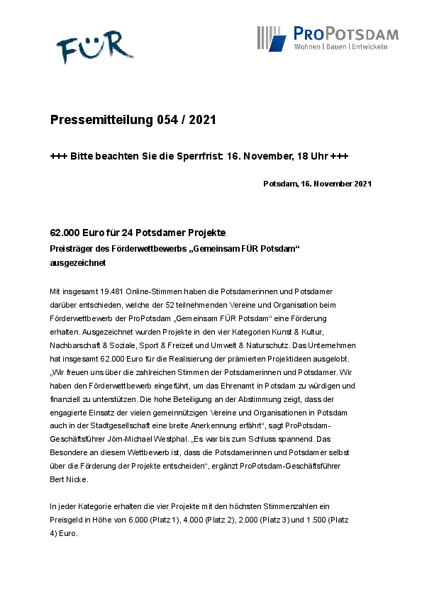Mit insgesamt 19.481 Online-Stimmen haben die Potsdamerinnen und Potsdamer darüber entschieden, welche der 52 teilnehmenden Vereine und Organisation beim Förderwettbewerb der ProPotsdam „Gemeinsam FÜR Potsdam“ eine Förderung erhalten. Ausgezeichnet wurden Projekte in den vier Kategorien Kunst & Kultur, Nachbarschaft & Soziale, Sport & Freizeit und Umwelt & Naturschutz. Das Unternehmen hat insgesamt 62.000 Euro für die Realisierung der prämierten Projektideen ausgelobt. „Wir freuen uns über die zahlreichen Stimmen der Potsdamerinnen und Potsdamer. Wir haben den Förderwettbewerb eingeführt, um das Ehrenamt in Potsdam zu würdigen und finanziell zu unterstützen. Die hohe Beteiligung an der Abstimmung zeigt, dass der engagierte Einsatz der vielen gemeinnützigen Vereine und Organisationen in Potsdam auch in der Stadtgesellschaft eine breite Anerkennung erfährt“, sagt ProPotsdam-Geschäftsführer Jörn-Michael Westphal. „Es war bis zum Schluss spannend. Das Besondere an diesem Wettbewerb ist, dass die Potsdamerinnen und Potsdamer selbst über die Förderung der Projekte entscheiden“, ergänzt ProPotsdam-Geschäftsführer Bert Nicke.