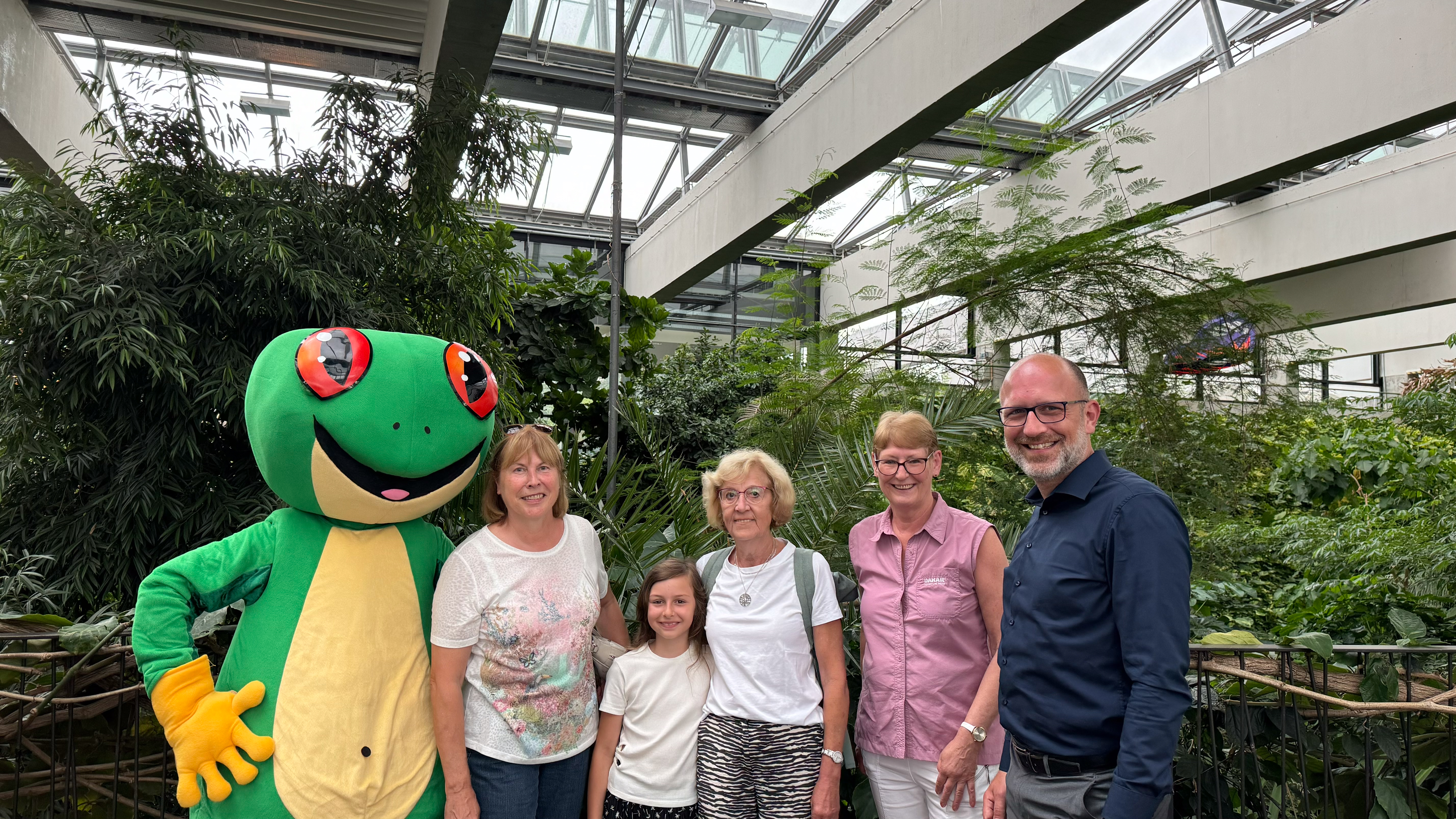 01.07.2024In der Biosphäre Potsdam wurde heute der 3. Millionste Gast begrüßt – seit der Eröffnung 2002: Margitta Ziemer aus Töplitz besuchte die tropische Naturerlebniswelt zusammen mit Freundinnen aus Gera, Beate Rothe sowie Bärbel Schmidt und ihre Enkelin Lucy. Sebastian Leifgen, Geschäftsführer der ProPotsdam Naturerlebniswelt GmbH, und Maskottchen Josch der Frosch überraschten die Gruppe mit einer Familienkarte für die Potsdamer Tropenwelt sowie ein paar regionalen Spezialitäten und Andenken aus der Biosphäre Potsdam.